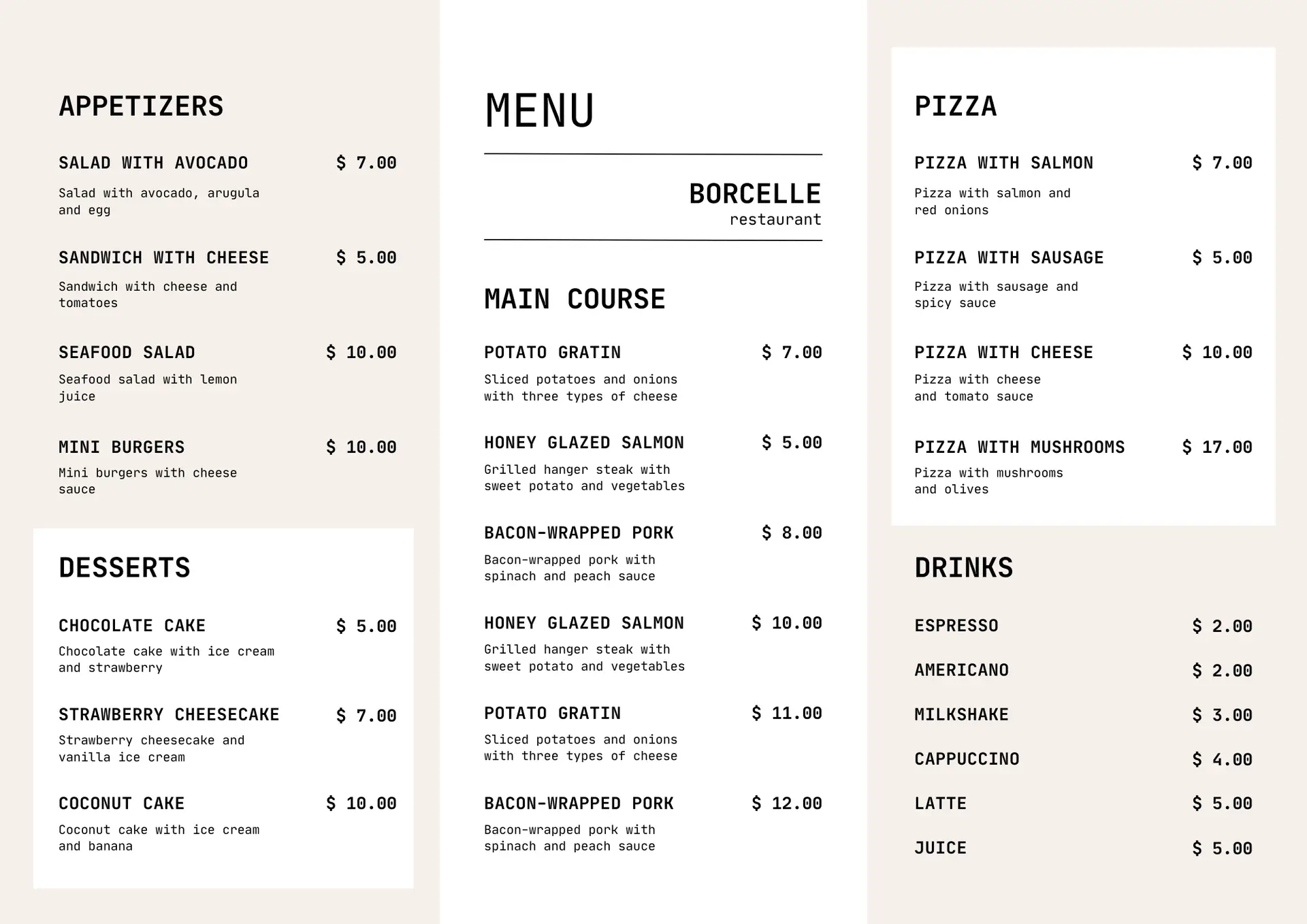 I can design a modern food menu, restaurant, and digital menu for you. I am passionate to create a modern and unique food menu designs. My preference is to make you happy and 100% satisfied.